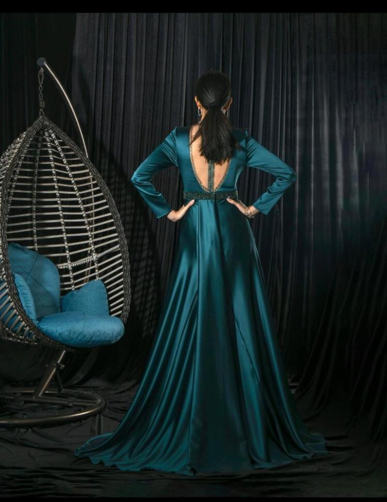 فستان اخضر ستان بفتحة وبطانة فوشي.