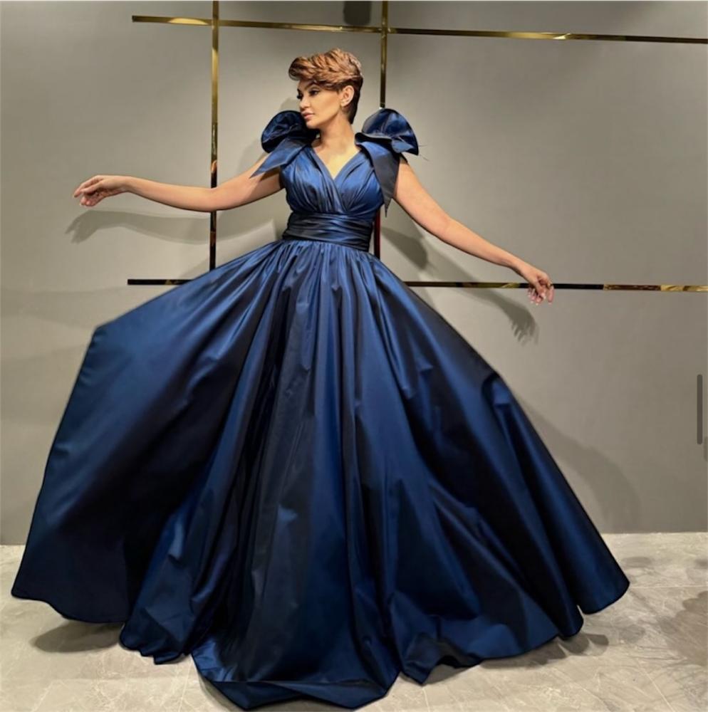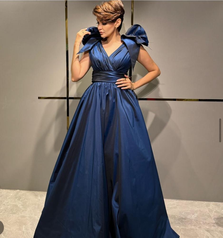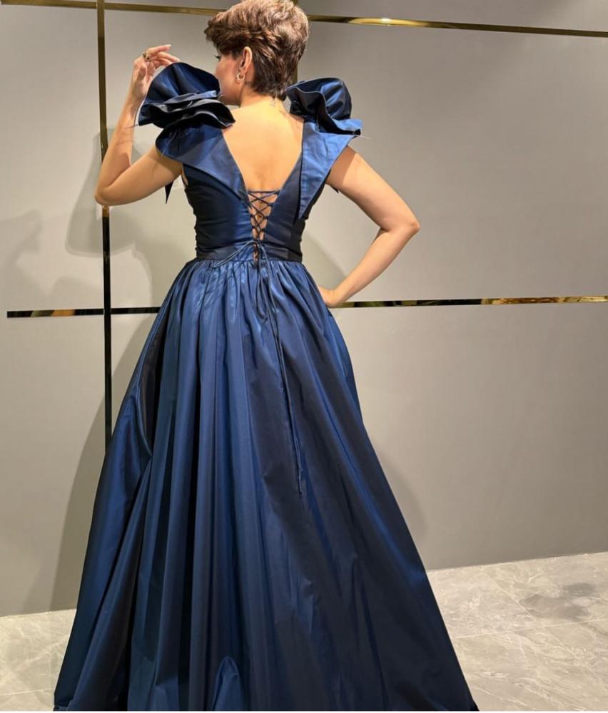 فستان كحلي تفتة مع حبال ربط من الظهر.