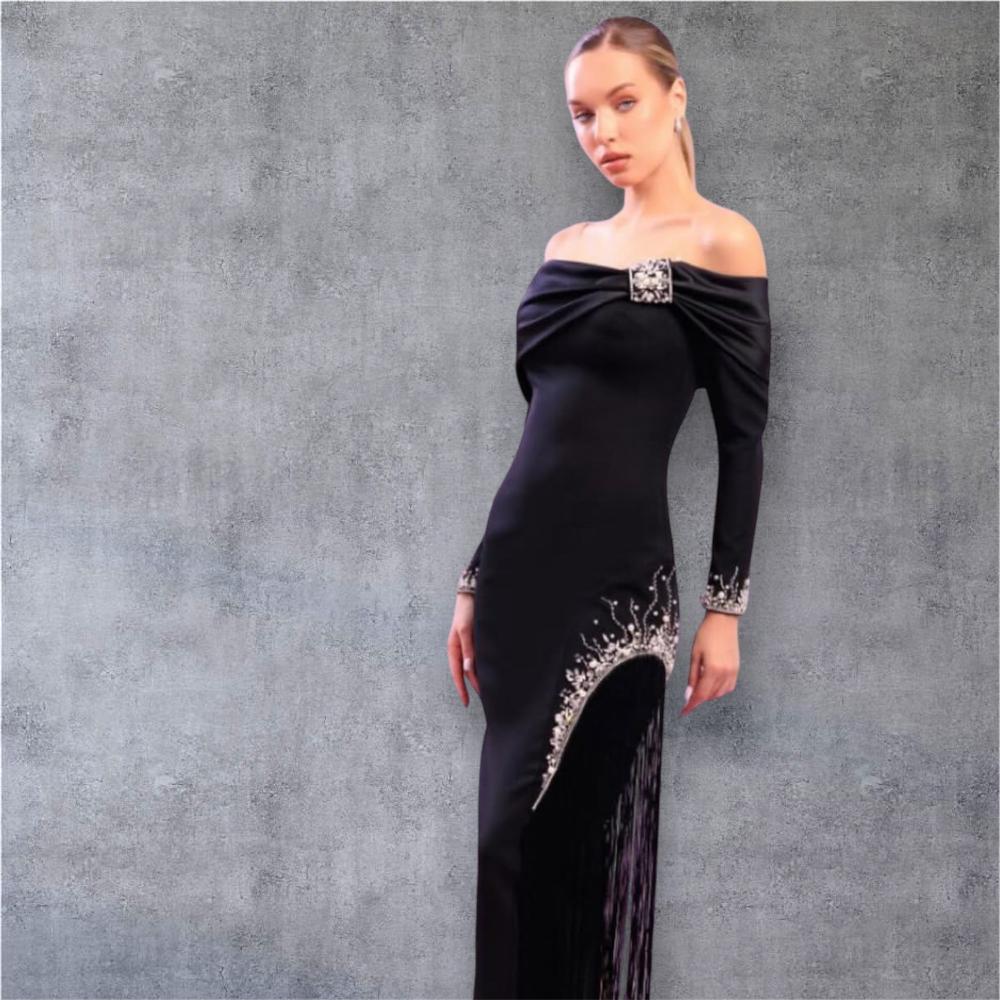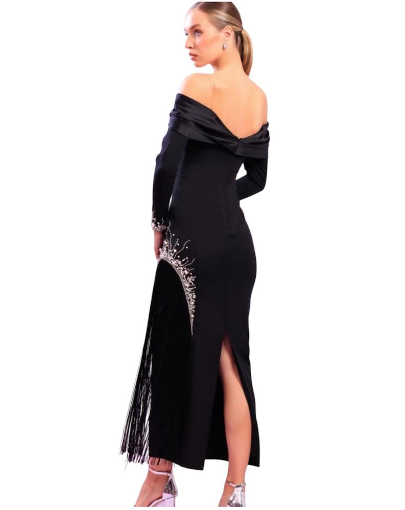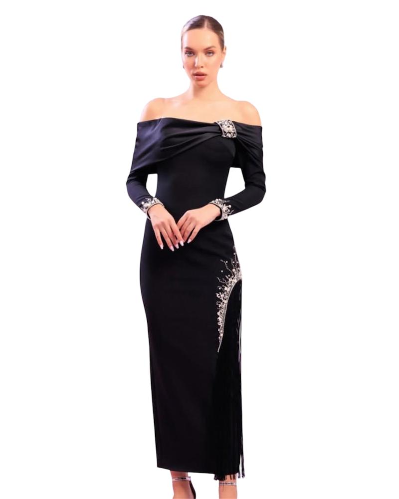 فستان كريب اسود اوف شولدر بتطريز فصوص يمتد الى قبل الكاحل